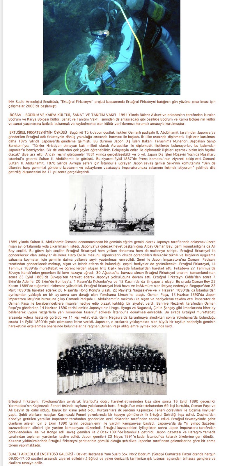 Japonyadan dönerken 1890 yılında batan Ertuğrul Fırkateyi'nde yapılan kazı çalışmalarında çıkarılan 828 parça Bodrum'da Sualtı Arkeolojisi Enstitüsü galerisinde 5 Kasım 2010'e kadar sergileniyor.